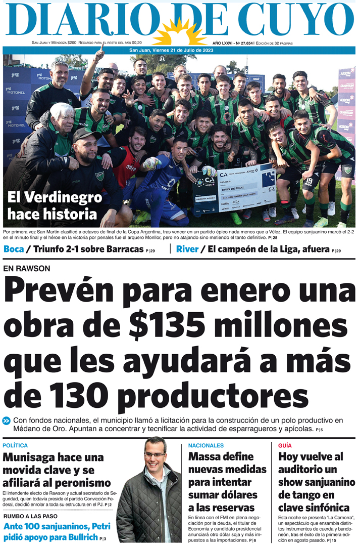 Diario de Cuyo | HOME | Noticias Tapa Edición 21 de Julio de 2023 Por Redacción Diario de Cuyo 21/07/2023 · 0:00 Escuchar la noticia Escuchar la noticia Your browser doesn’t support HTML5 audio Ver los comentarios ›