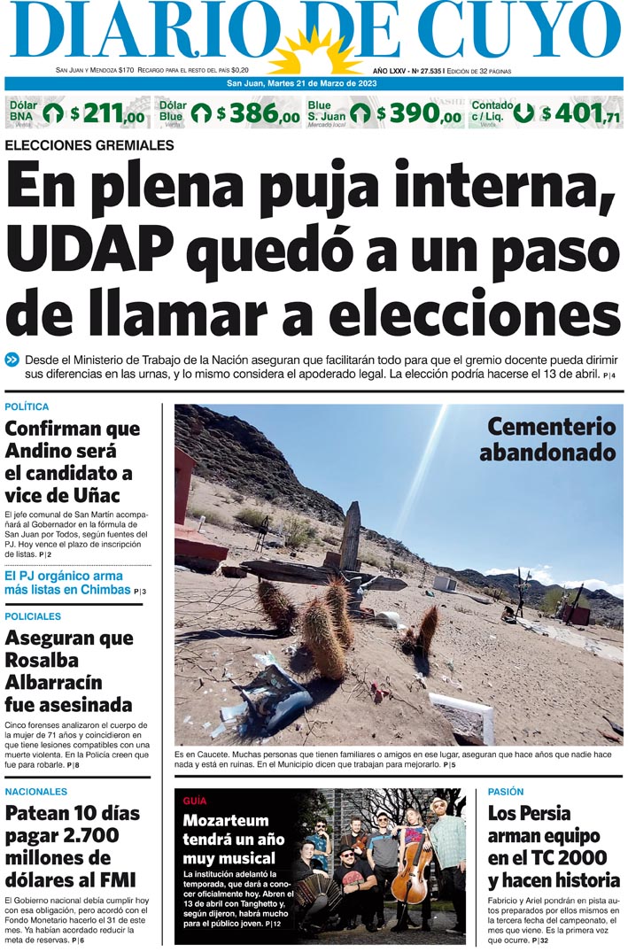 Diario de Cuyo | HOME | Noticias Tapa Edición 21 de Marzo del 2023 Por Redacción Diario de Cuyo 20/03/2023 · 0:00 Escuchar la noticia Escuchar la noticia Your browser doesn’t support HTML5 audio Ver los comentarios ›