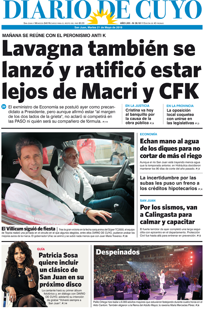 Diario de Cuyo | HOME | Noticias | Tapa Edición Tapa Edición 21 de Mayo 2019 Por Redacción Diario de Cuyo 20/05/2019 · 0:00 Escuchar la noticia Escuchar la noticia Your browser doesn’t support HTML5 audio Tapa Edición Ver los comentarios ›