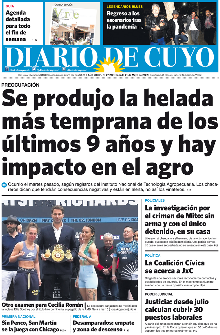 Diario de Cuyo | HOME | Noticias Tapa Edición 21 de Mayo de 2022 Por Redacción Diario de Cuyo 21/05/2022 · 0:00 Escuchar la noticia Escuchar la noticia Your browser doesn’t support HTML5 audio Ver los comentarios ›