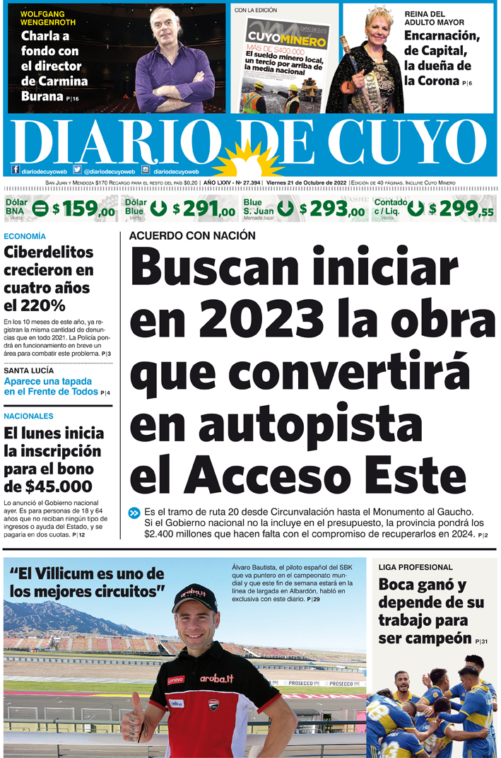 Diario de Cuyo | HOME | Noticias Tapa Edición 21 de Octubre de 2022 Por Redacción Diario de Cuyo 20/10/2022 · 0:00 Escuchar la noticia Escuchar la noticia Your browser doesn’t support HTML5 audio Ver los comentarios ›