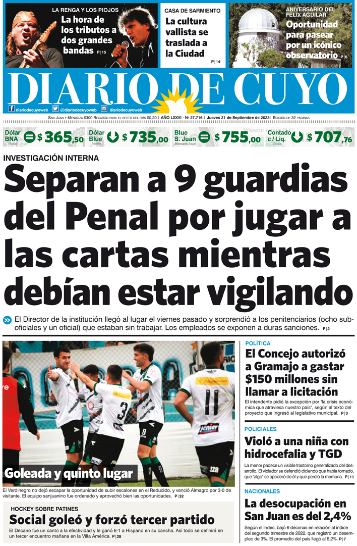 Diario de Cuyo | HOME | Noticias Tapa Edición 21 de Septiembre del 2023 Por Redacción Diario de Cuyo 21/09/2023 · 0:00 Escuchar la noticia Escuchar la noticia Your browser doesn’t support HTML5 audio Ver los comentarios ›