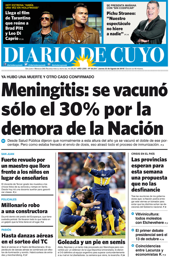 Diario de Cuyo | HOME | Noticias | Tapa Edición Tapa edición 22 de Agosto 2019 Por Redacción Diario de Cuyo 21/08/2019 · 0:00 Escuchar la noticia Escuchar la noticia Your browser doesn’t support HTML5 audio Tapa Edición Ver los comentarios ›