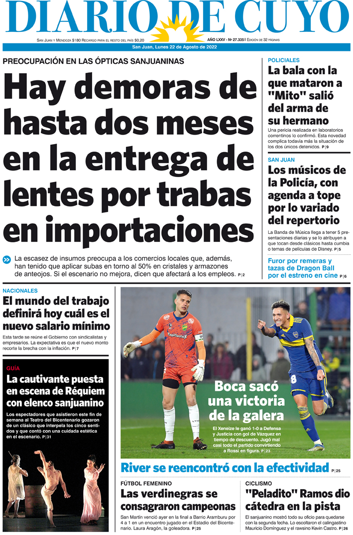 Diario de Cuyo | HOME | Noticias Tapa Edición 22 de Agosto del 2022 Por Redacción Diario de Cuyo 22/08/2022 · 0:00 Escuchar la noticia Escuchar la noticia Your browser doesn’t support HTML5 audio Ver los comentarios ›