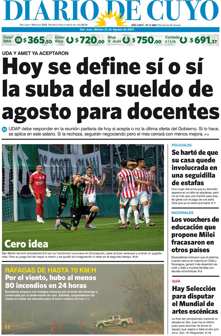 Diario de Cuyo | HOME | Noticias Tapa Edición 22 de Agosto del 2023 Por Redacción Diario de Cuyo 21/08/2023 · 0:00 Escuchar la noticia Escuchar la noticia Your browser doesn’t support HTML5 audio Ver los comentarios ›