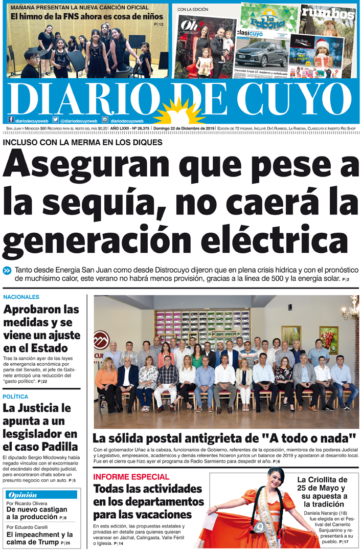 Diario de Cuyo | HOME | Noticias | Tapa Edición Tapa Edición 22 de Diciembre 2019 Por Redacción Diario de Cuyo 22/12/2019 · 0:00 Escuchar la noticia Escuchar la noticia Your browser doesn’t support HTML5 audio Tapa Edición Ver los comentarios ›