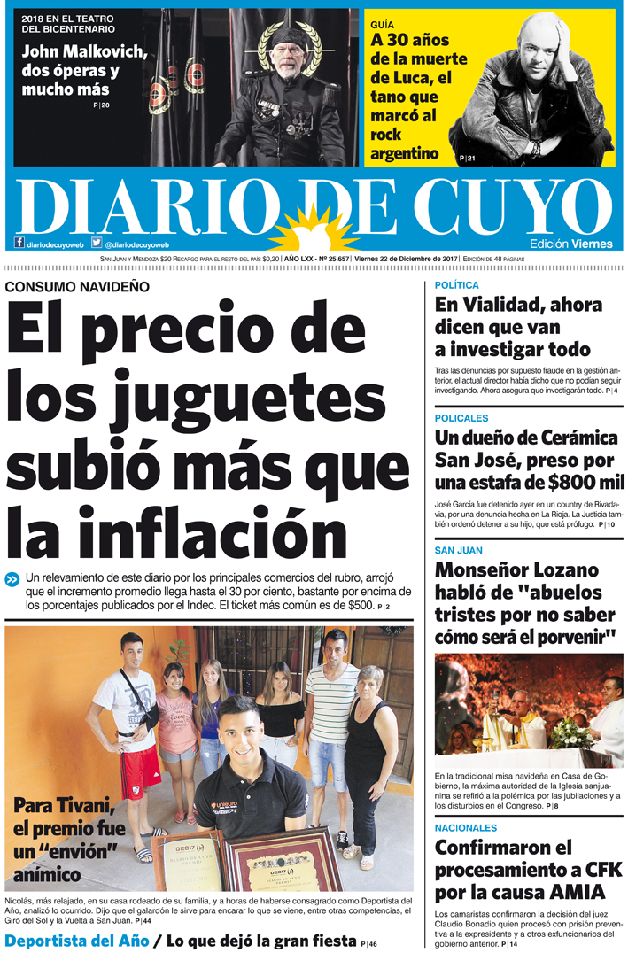 Diario de Cuyo | HOME | Noticias | Tapa Edición Tapa Edición 22 de Diciembre del 2017 Por Redacción Diario de Cuyo 22/12/2017 · 0:00 Escuchar la noticia Escuchar la noticia Your browser doesn’t support HTML5 audio Tapa Edición Ver los comentarios ›