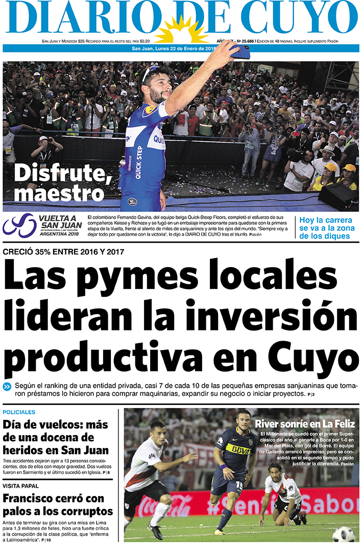 Diario de Cuyo | HOME | Noticias | Tapa Edición Tapa Edición 22 de Enero del 2018 Por Redacción Diario de Cuyo 22/01/2018 · 0:00 Escuchar la noticia Escuchar la noticia Your browser doesn’t support HTML5 audio Tapa Edición Ver los comentarios ›