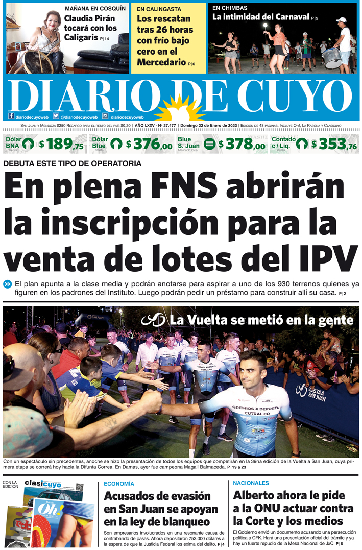 Diario de Cuyo | HOME | Noticias Tapa Edición 22 de Enero del 2023 Por Redacción Diario de Cuyo 21/01/2023 · 0:00 Escuchar la noticia Escuchar la noticia Your browser doesn’t support HTML5 audio Ver los comentarios ›