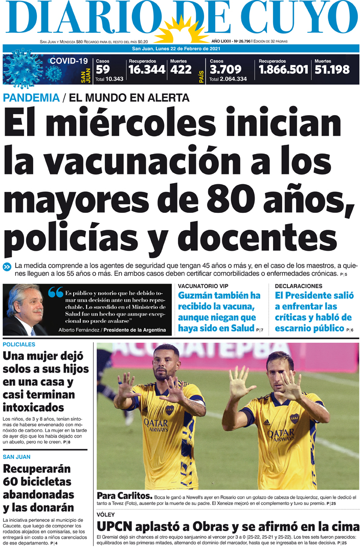 Diario de Cuyo | HOME | Noticias Tapa Edición 22 de Febrero del 2021 Por Redacción Diario de Cuyo 21/02/2021 · 0:00 Escuchar la noticia Escuchar la noticia Your browser doesn’t support HTML5 audio Ver los comentarios ›