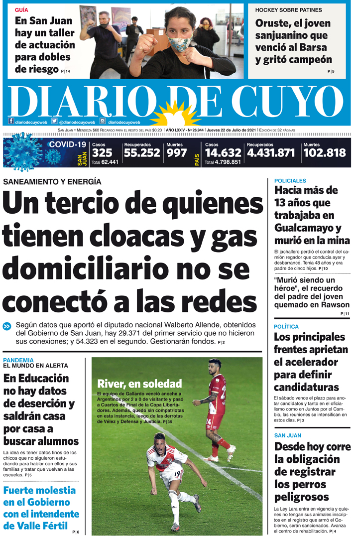 Diario de Cuyo | HOME | Noticias Tapa Edición 22 de Julio del 2021 Por Redacción Diario de Cuyo 22/07/2021 · 0:00 Escuchar la noticia Escuchar la noticia Your browser doesn’t support HTML5 audio Ver los comentarios ›