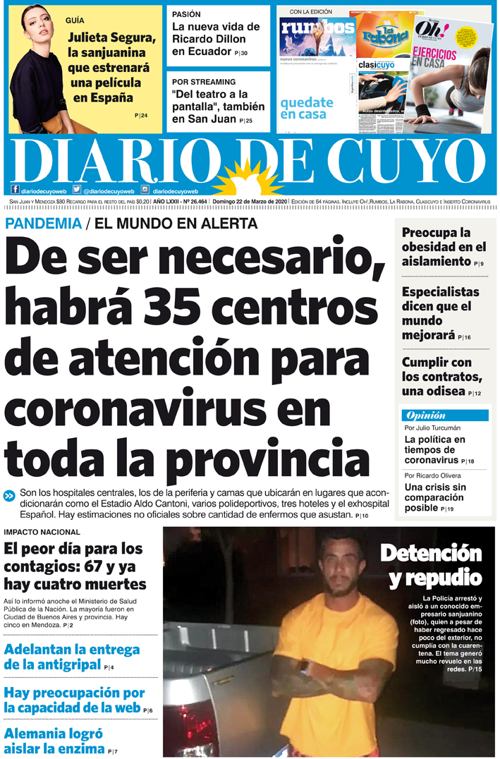 Diario de Cuyo | HOME | Noticias | Tapa Edición Tapa Edición 22 de Marzo de 2020 Por Redacción Diario de Cuyo 21/03/2020 · 0:00 Escuchar la noticia Escuchar la noticia Your browser doesn’t support HTML5 audio Tapa Edición Ver los comentarios ›