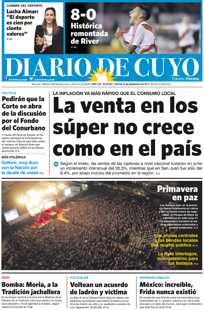 Diario de Cuyo | HOME | Noticias Tapa Edicion 22 de Septiembre 2017 Por Redacción Diario de Cuyo 22/09/2017 · 0:00 Escuchar la noticia Escuchar la noticia Your browser doesn’t support HTML5 audio Ver los comentarios ›