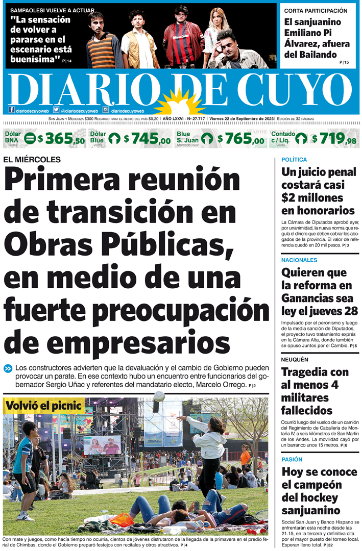 Diario de Cuyo | HOME | Noticias Tapa Edición 22 de Septiembre de 2023 Por Redacción Diario de Cuyo 21/09/2023 · 0:00 Escuchar la noticia Escuchar la noticia Your browser doesn’t support HTML5 audio Ver los comentarios ›