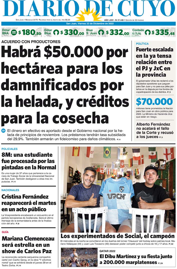 Diario de Cuyo | HOME | Noticias Tapa Edición 23 de Diciembre de 2022 Por Redacción Diario de Cuyo 22/12/2022 · 0:00 Escuchar la noticia Escuchar la noticia Your browser doesn’t support HTML5 audio Ver los comentarios ›