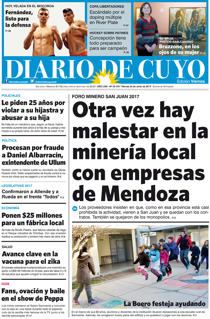 Diario de Cuyo | HOME | Noticias Tapa Edición 23 de Junio del 2017 Por Redacción Diario de Cuyo 22/06/2017 · 0:00 Escuchar la noticia Escuchar la noticia Your browser doesn’t support HTML5 audio Ver los comentarios ›