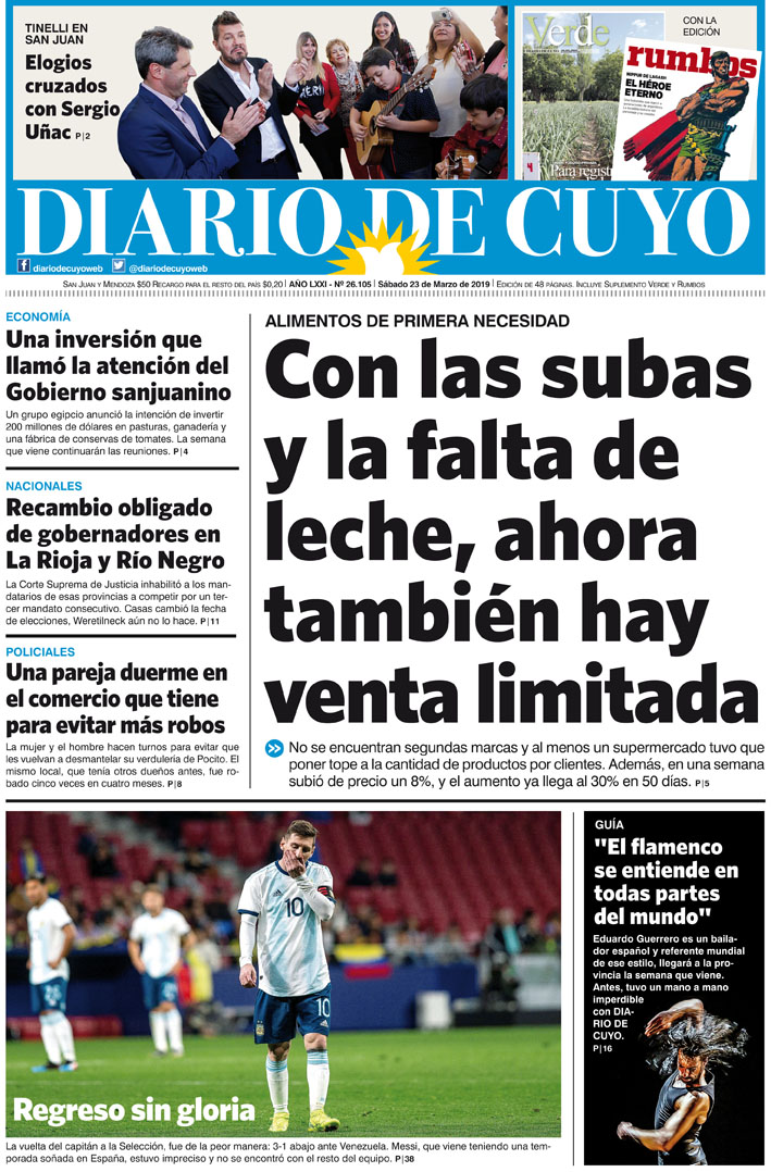 Diario de Cuyo | HOME | Noticias | Tapa Edición Tapa Edición 23 de Marzo 2019 Por Redacción Diario de Cuyo 22/03/2019 · 0:00 Escuchar la noticia Escuchar la noticia Your browser doesn’t support HTML5 audio Tapa Edición Ver los comentarios ›