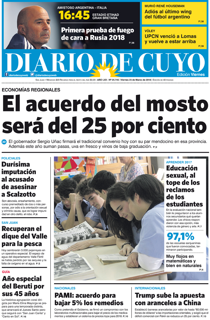 Diario de Cuyo | HOME | Noticias Tapa Edición 23 de Marzo del 2018 Por Redacción Diario de Cuyo 22/03/2018 · 0:00 Escuchar la noticia Escuchar la noticia Your browser doesn’t support HTML5 audio Ver los comentarios ›