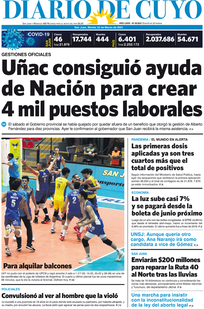 Diario de Cuyo | HOME | Noticias Tapa Edición 23 de Marzo del 2021 Por Redacción Diario de Cuyo 22/03/2021 · 0:00 Escuchar la noticia Escuchar la noticia Your browser doesn’t support HTML5 audio Ver los comentarios ›