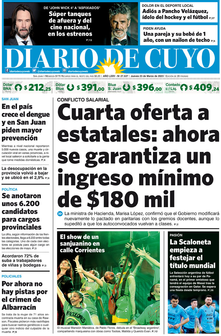 Diario de Cuyo | HOME | Noticias Tapa Edición 23 de Marzo del 2023 Por Redacción Diario de Cuyo 22/03/2023 · 0:00 Escuchar la noticia Escuchar la noticia Your browser doesn’t support HTML5 audio Ver los comentarios ›