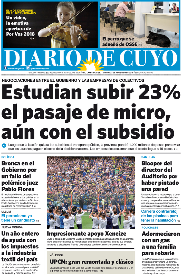 Diario de Cuyo | HOME | Noticias | Tapa Edición Tapa Edición 23 de Noviembre 2018 Por Redacción Diario de Cuyo 23/11/2018 · 0:00 Escuchar la noticia Escuchar la noticia Your browser doesn’t support HTML5 audio Tapa Edición Ver los comentarios ›