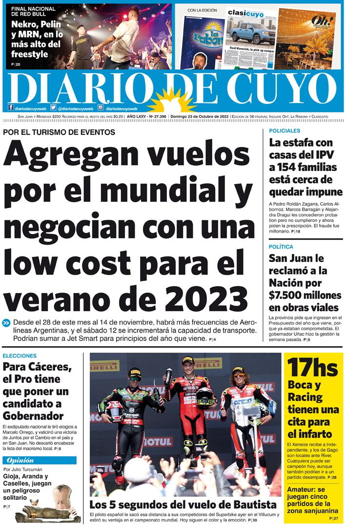 Diario de Cuyo | HOME | Noticias Tapa Edición 23 de Octubre del 2022 Por Redacción Diario de Cuyo 22/10/2022 · 0:00 Escuchar la noticia Escuchar la noticia Your browser doesn’t support HTML5 audio Ver los comentarios ›