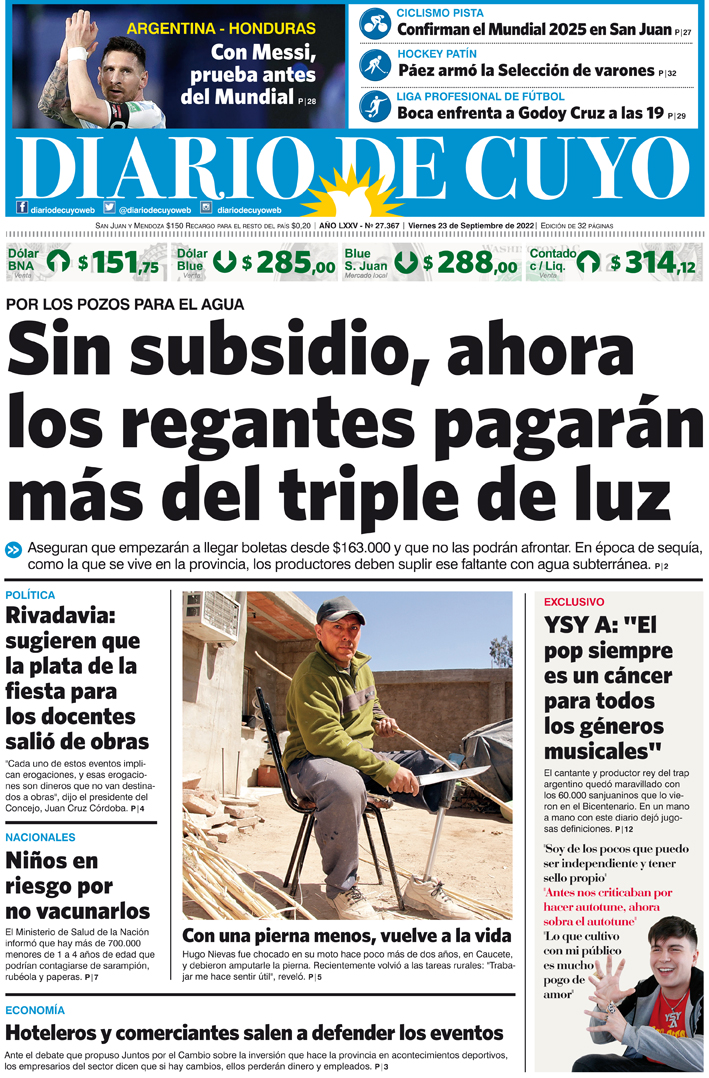 Diario de Cuyo | HOME | Noticias Tapa Edición 23 de Septiembre del 2022 Por Redacción Diario de Cuyo 22/09/2022 · 0:00 Escuchar la noticia Escuchar la noticia Your browser doesn’t support HTML5 audio Ver los comentarios ›