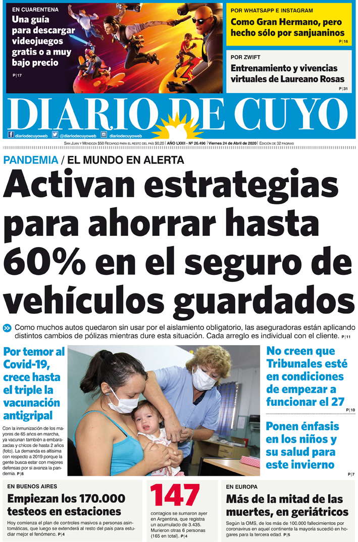 Diario de Cuyo | HOME | Noticias | Tapa Edición Tapa Edición 24 de Abril de 2020 Por Redacción Diario de Cuyo 23/04/2020 · 0:00 Escuchar la noticia Escuchar la noticia Your browser doesn’t support HTML5 audio Tapa Edición Ver los comentarios ›