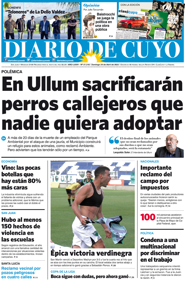 Diario de Cuyo | HOME | Noticias Tapa Edición 24 de Abril del 2022 Por Redacción Diario de Cuyo 23/04/2022 · 0:00 Escuchar la noticia Escuchar la noticia Your browser doesn’t support HTML5 audio Ver los comentarios ›