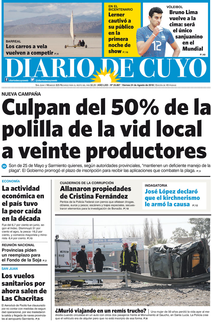 Diario de Cuyo | HOME | Noticias | Tapa Edición Tapa Edición 24 de Agosto 2018 Por Redacción Diario de Cuyo 23/08/2018 · 0:00 Escuchar la noticia Escuchar la noticia Your browser doesn’t support HTML5 audio Tapa Edición Ver los comentarios ›