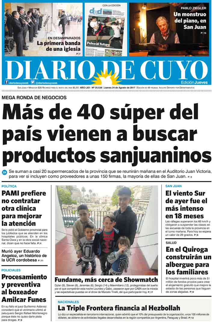 Diario de Cuyo | HOME | Noticias Tapa Edición 24 de Agosto de 2017 Por Redacción Diario de Cuyo 23/08/2017 · 0:00 Escuchar la noticia Escuchar la noticia Your browser doesn’t support HTML5 audio Ver los comentarios ›