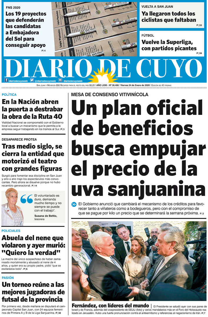 Diario de Cuyo | HOME | Noticias Tapa Edición 24 de Enero de 2020 Por Redacción Diario de Cuyo 23/01/2020 · 0:00 Escuchar la noticia Escuchar la noticia Your browser doesn’t support HTML5 audio Ver los comentarios ›