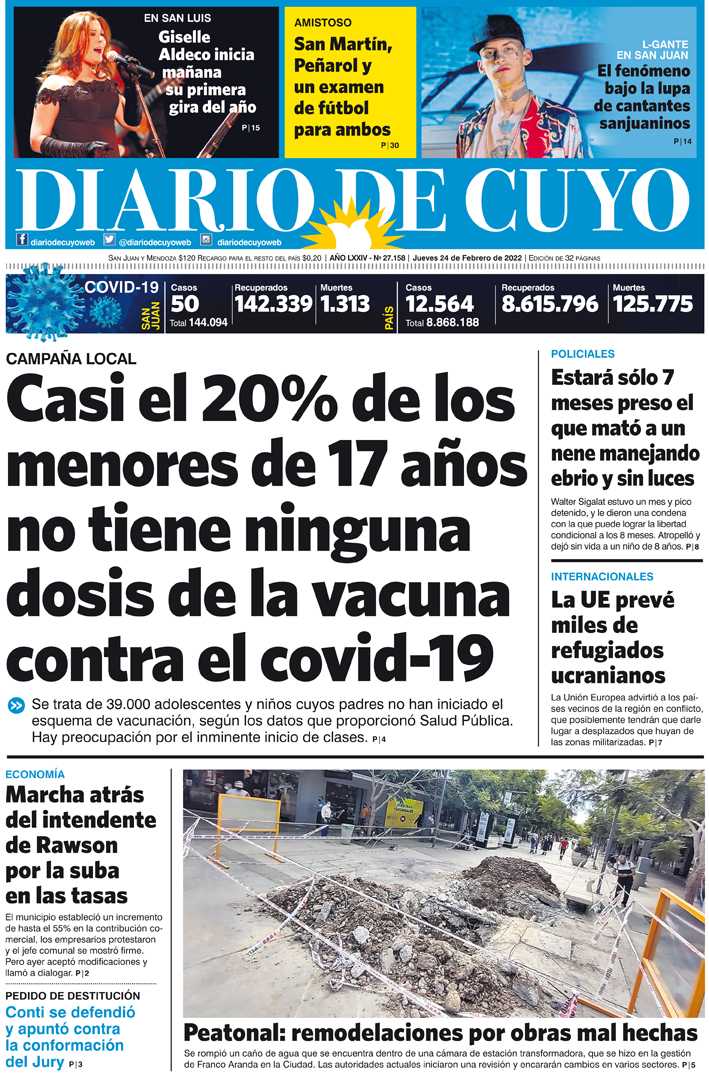 Diario de Cuyo | HOME | Noticias Tapa Edición 24 de Febrero del 2022 Por Redacción Diario de Cuyo 23/02/2022 · 0:00 Escuchar la noticia Escuchar la noticia Your browser doesn’t support HTML5 audio Ver los comentarios ›