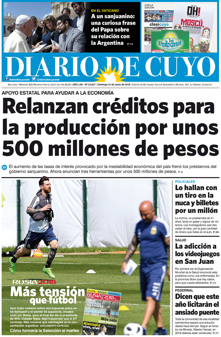 Diario de Cuyo | HOME | Noticias | Tapa Edición Tapa Edición 24 de Junio 2018 Por Redacción Diario de Cuyo 24/06/2018 · 0:00 Escuchar la noticia Escuchar la noticia Your browser doesn’t support HTML5 audio Tapa Edición Ver los comentarios ›
