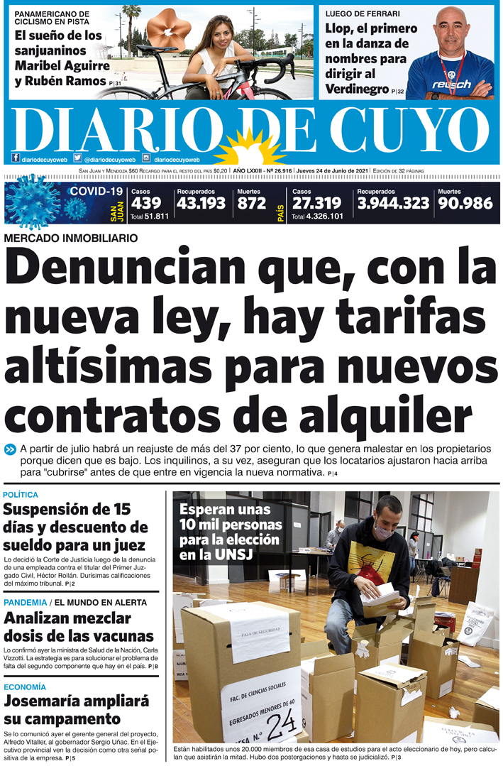 Diario de Cuyo | HOME | Noticias Tapa Edición 24 de Junio del 2021 Por Redacción Diario de Cuyo 23/06/2021 · 0:00 Escuchar la noticia Escuchar la noticia Your browser doesn’t support HTML5 audio Ver los comentarios ›