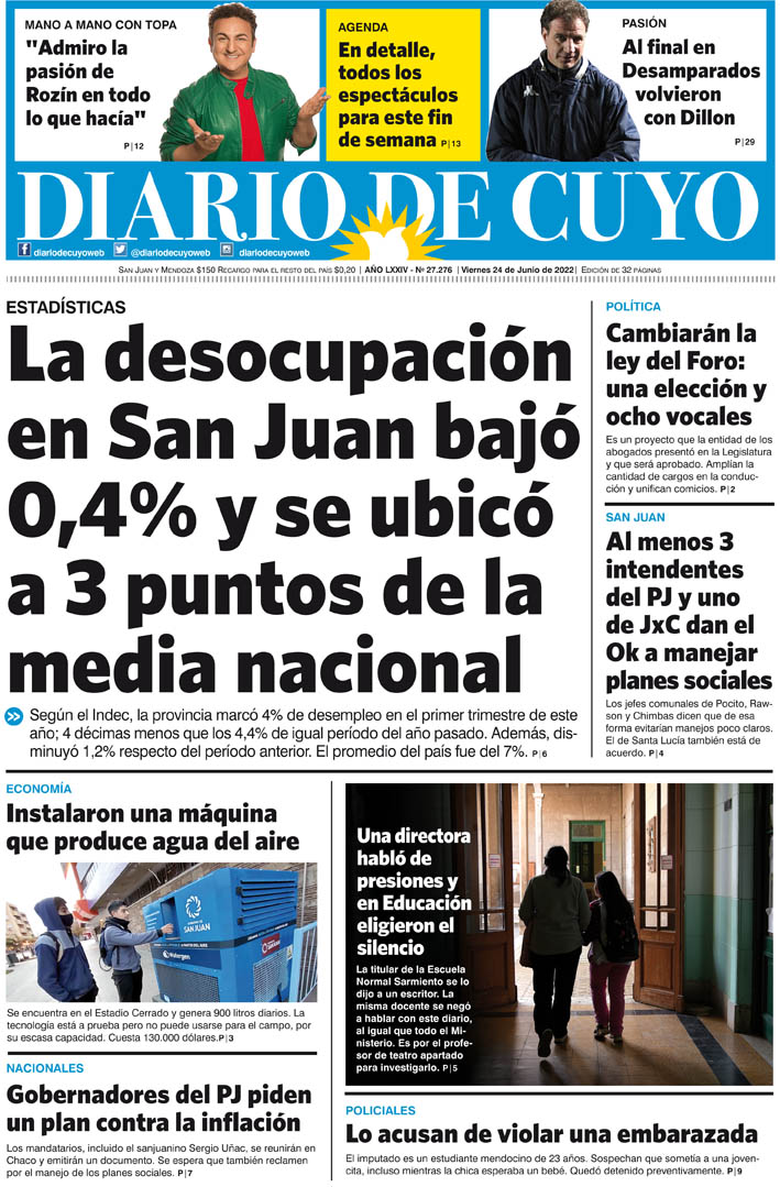 Diario de Cuyo | HOME | Noticias Tapa Edición 24 de Junio del 2022 Por Redacción Diario de Cuyo 23/06/2022 · 0:00 Escuchar la noticia Escuchar la noticia Your browser doesn’t support HTML5 audio Ver los comentarios ›