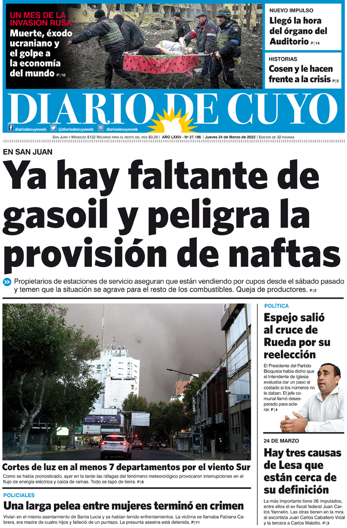Diario de Cuyo | HOME | Noticias Tapa Edición 24 de Marzo de 2022 Por Redacción Diario de Cuyo 23/03/2022 · 0:00 Escuchar la noticia Escuchar la noticia Your browser doesn’t support HTML5 audio Ver los comentarios ›