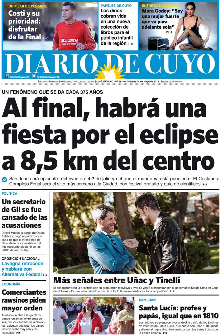 Diario de Cuyo | HOME | Noticias | Tapa Edición Tapa Edición 24 de Mayo 2019 Por Redacción Diario de Cuyo 23/05/2019 · 0:00 Escuchar la noticia Escuchar la noticia Your browser doesn’t support HTML5 audio Tapa Edición Ver los comentarios ›