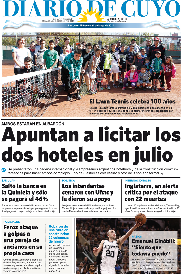 Diario de Cuyo | HOME | Noticias Tapa Edición 24 de Mayo del 2017 Por Redacción Diario de Cuyo 23/05/2017 · 0:00 Escuchar la noticia Escuchar la noticia Your browser doesn’t support HTML5 audio Ver los comentarios ›