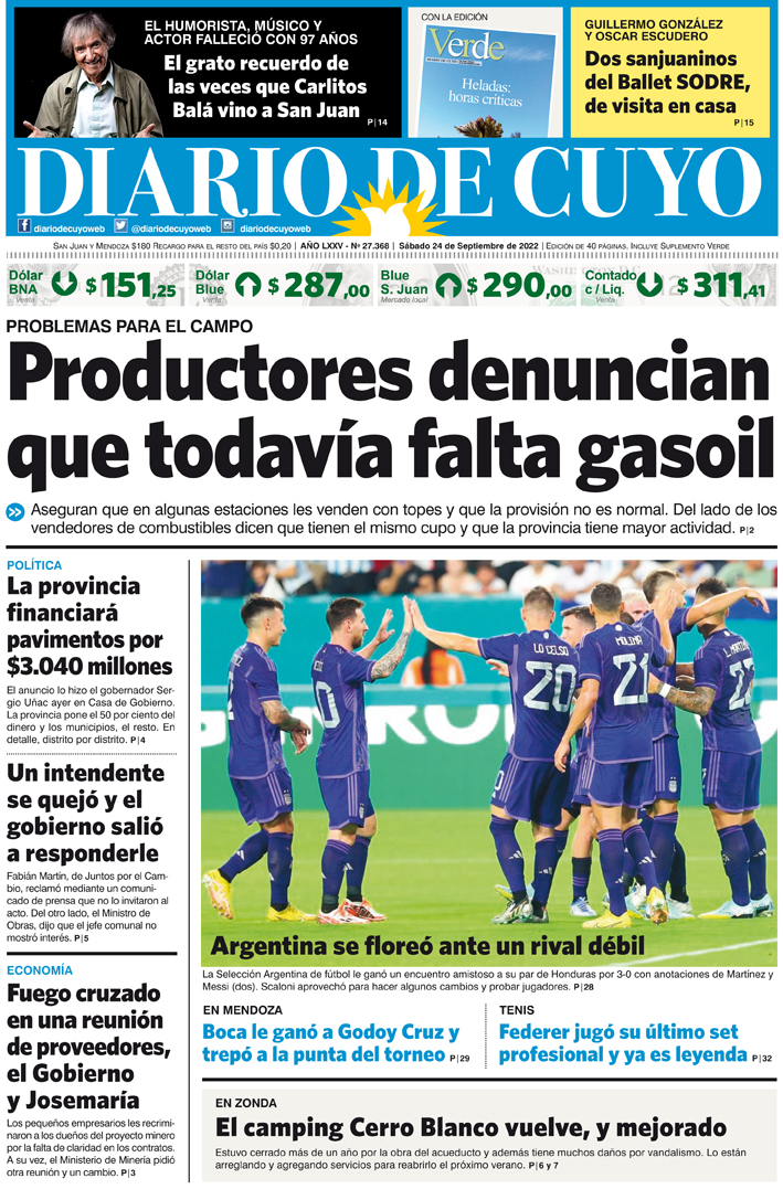Diario de Cuyo | HOME | Noticias Tapa Edición 24 de Septiembre de 2022 Por Redacción Diario de Cuyo 24/09/2022 · 0:00 Escuchar la noticia Escuchar la noticia Your browser doesn’t support HTML5 audio Ver los comentarios ›