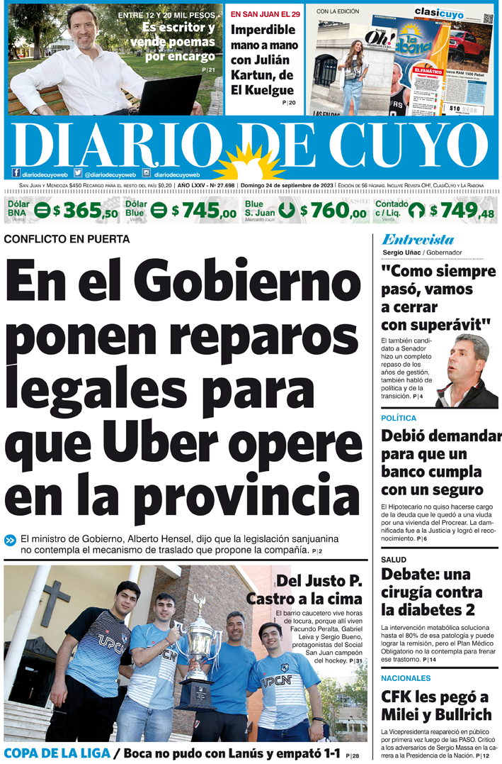 Diario de Cuyo | HOME | Noticias Tapa Edición 24 de Septiembre de 2023 Por Redacción Diario de Cuyo 23/09/2023 · 0:00 Escuchar la noticia Escuchar la noticia Your browser doesn’t support HTML5 audio Ver los comentarios ›