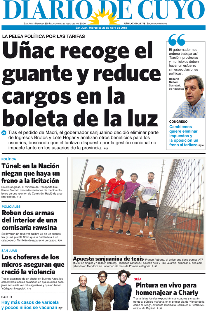 Diario de Cuyo | HOME | Noticias | Tapa Edición Tapa Edición 25 de Abril de 2018 Por Redacción Diario de Cuyo 25/04/2018 · 0:00 Escuchar la noticia Escuchar la noticia Your browser doesn’t support HTML5 audio Tapa Edición Ver los comentarios ›