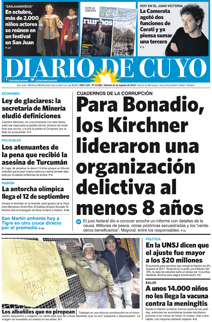 Diario de Cuyo | HOME | Noticias | Tapa Edición Tapa Edición 25 de Agosto 2018 Por Redacción Diario de Cuyo 25/08/2018 · 0:00 Escuchar la noticia Escuchar la noticia Your browser doesn’t support HTML5 audio Tapa Edición Ver los comentarios ›