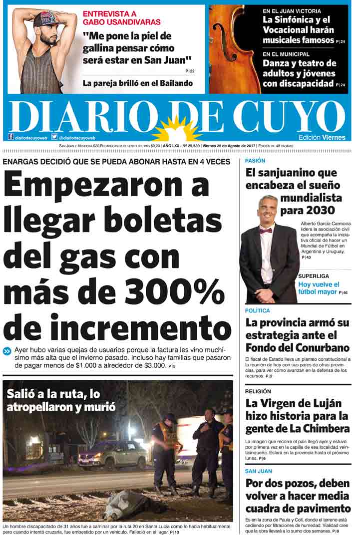 Diario de Cuyo | HOME | Noticias Tapa Edición 25 de Agosto de 2017 Por Redacción Diario de Cuyo 25/08/2017 · 0:00 Escuchar la noticia Escuchar la noticia Your browser doesn’t support HTML5 audio Ver los comentarios ›