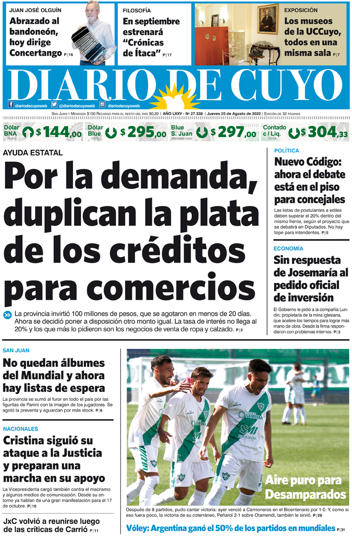 Diario de Cuyo | HOME | Noticias Tapa Edición 25 de Agosto del 2022 Por Redacción Diario de Cuyo 24/08/2022 · 0:00 Escuchar la noticia Escuchar la noticia Your browser doesn’t support HTML5 audio Ver los comentarios ›