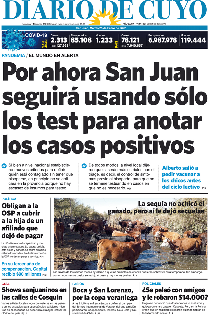Diario de Cuyo | HOME | Noticias Tapa Edición 25 de Enero del 2022 Por Redacción Diario de Cuyo 24/01/2022 · 0:00 Escuchar la noticia Escuchar la noticia Your browser doesn’t support HTML5 audio Ver los comentarios ›