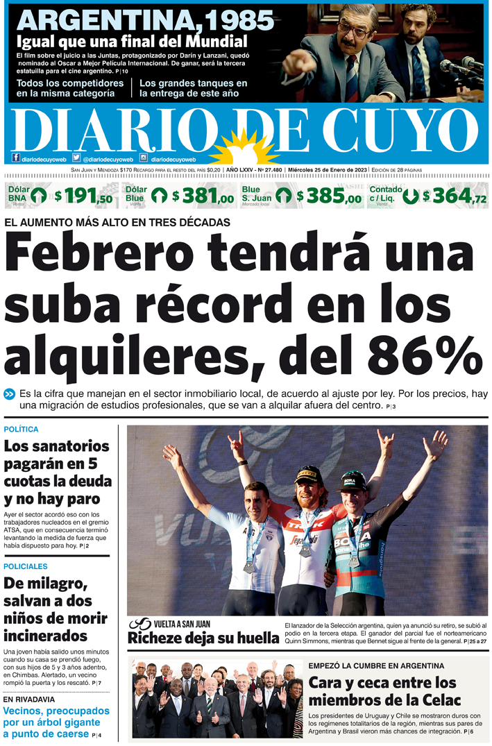 Diario de Cuyo | HOME | Noticias Tapa Edición 25 de Enero del 2023 Por Redacción Diario de Cuyo 24/01/2023 · 0:00 Escuchar la noticia Escuchar la noticia Your browser doesn’t support HTML5 audio Ver los comentarios ›