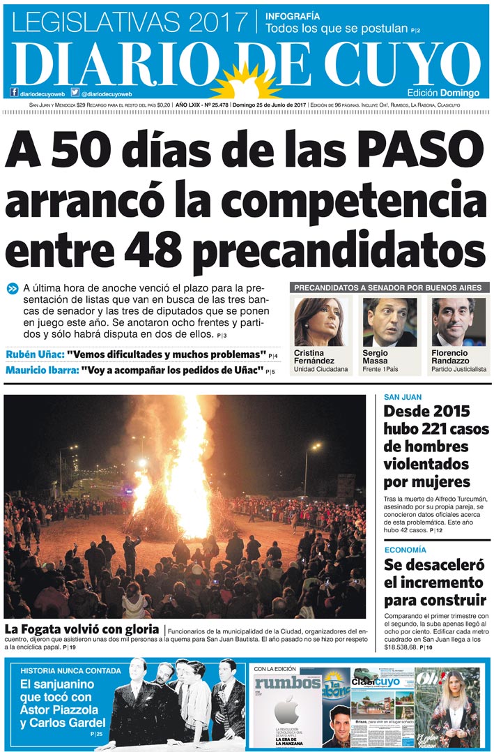 Diario de Cuyo | HOME | Noticias Tapa Edición 25 de Junio de 2017 Por Redacción Diario de Cuyo 25/06/2017 · 0:00 Escuchar la noticia Escuchar la noticia Your browser doesn’t support HTML5 audio Ver los comentarios ›