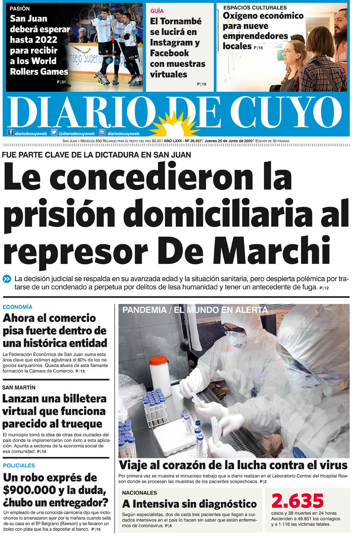 Diario de Cuyo | HOME | Noticias Tapa Edición 25 de Junio del 2020 Por Redacción Diario de Cuyo 24/06/2020 · 0:00 Escuchar la noticia Escuchar la noticia Your browser doesn’t support HTML5 audio Ver los comentarios ›