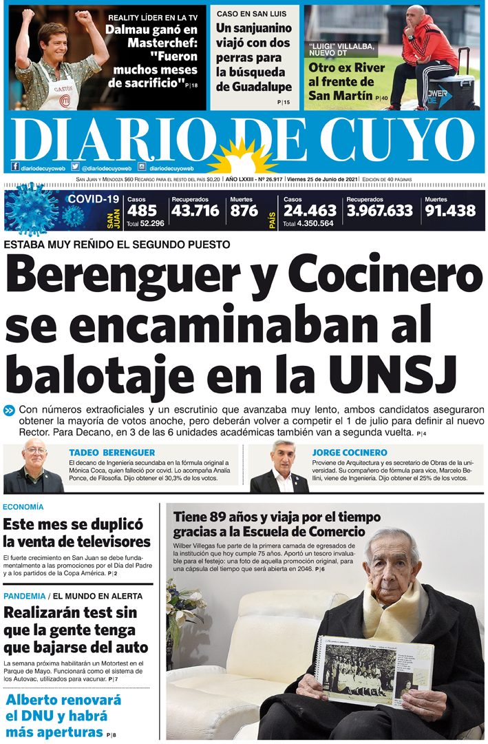 Diario de Cuyo | HOME | Noticias Tapa Edición 25 de Junio del 2021 Por Redacción Diario de Cuyo 25/06/2021 · 0:00 Escuchar la noticia Escuchar la noticia Your browser doesn’t support HTML5 audio Ver los comentarios ›